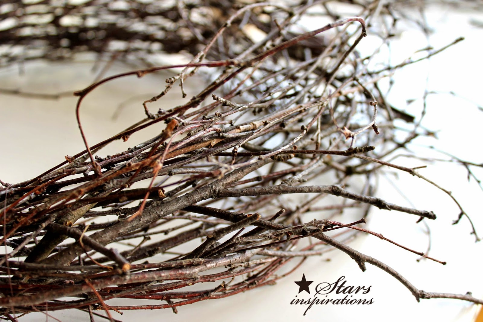 Zacznę od największego wieńca. W pobliskim parku pozbierałam z trawnika gałązki, które spadły z drzew i zabrałam je do domu. Dokupiłam jaja przepiórcze i opakowanie ozdób, w formie kul z różnych naturalnych materiałów (można je znaleźć w większości supermarketów). Przycięłam też trochę mój bukszpan z balkonu, żeby mieć kilka zielonych gałązek do wieńca.