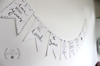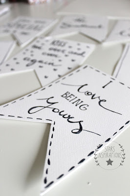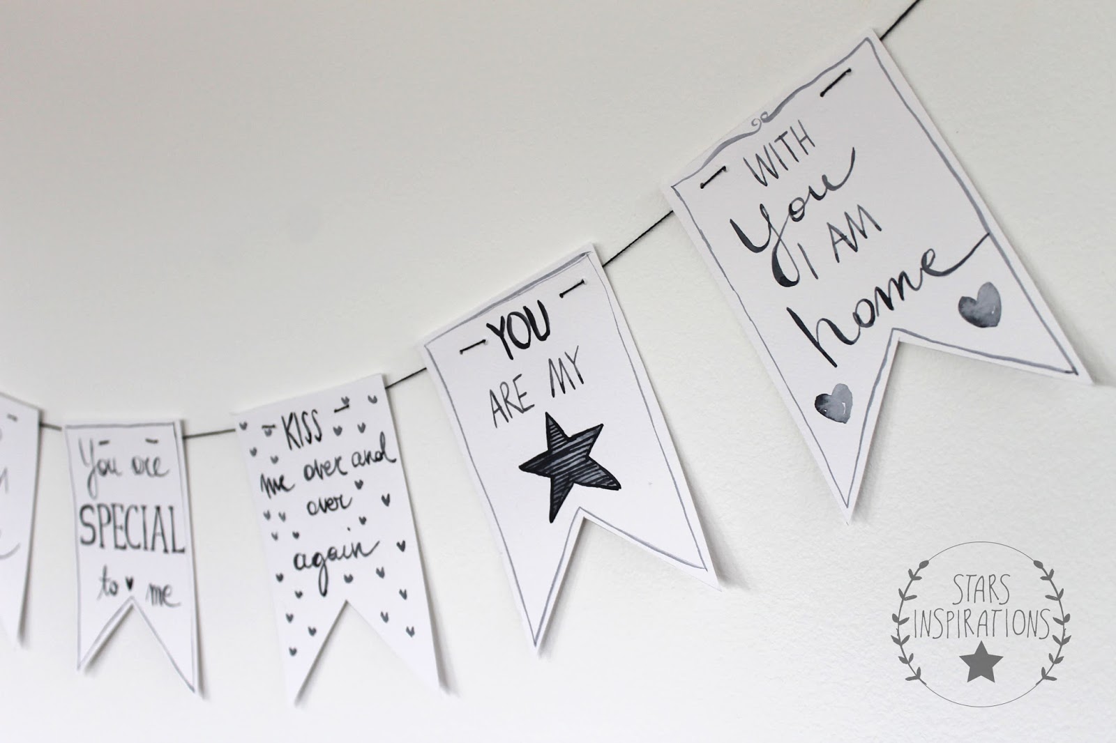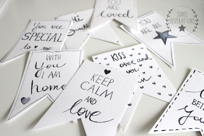 Girlandę wykonałam z papieru akwarelowego wyciętego w kształt flagi i pomalowałam go akwarelą w miłosne cytaty.
